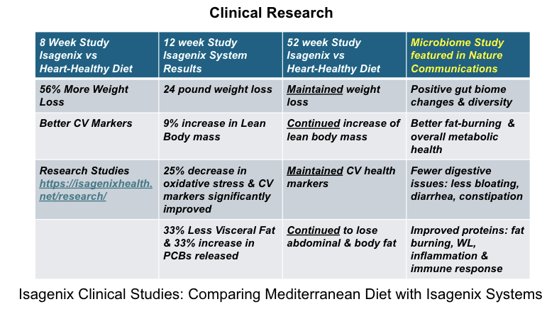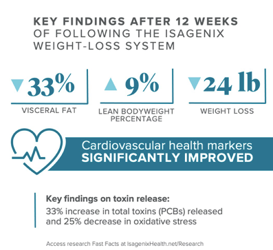 Results not typical. In a study performed in 2012 by University of Illinois at Chicago researchers, subjects lost an average of 9 pounds with an average of 2 pounds of the loss from visceral fat after 30 days on an Isagenix System. The subjects also had a greater level of adherence and had more consistent weight loss from week to week compared to subjects on a traditional diet. 12 week study Participants had a 25% reduction in Inflammation and a 9% increase in lean body mass. Research Studies can be found here.